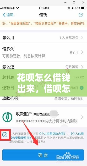 2、你可以选择“每月等额”或“先息后本”的还款方式。一般情况下,用户更倾向于选择“先息后本”,因为这种方式在前期还款压力较小。确认借款信息并提交:确认借款金额、期限、利息以及还款方式无误后,点击“确定”按钮进行借款申请。此时,你需要输入你的支付宝密码进行验证。