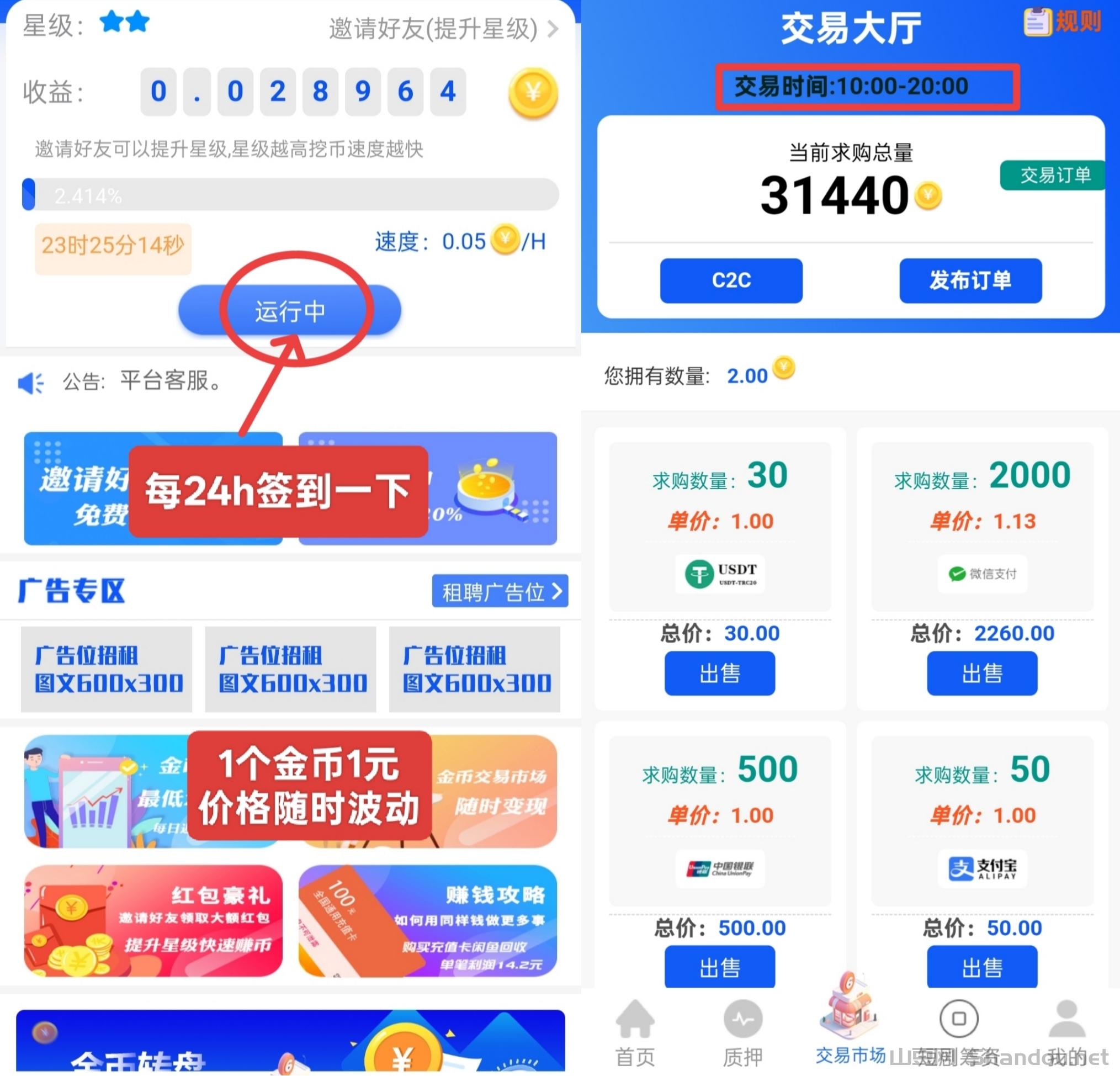 金币可以直接兑换现金,1金币=1元,随时可以提现。项目方不预留金币,所有收益都来自市场交易,保证公平透明。