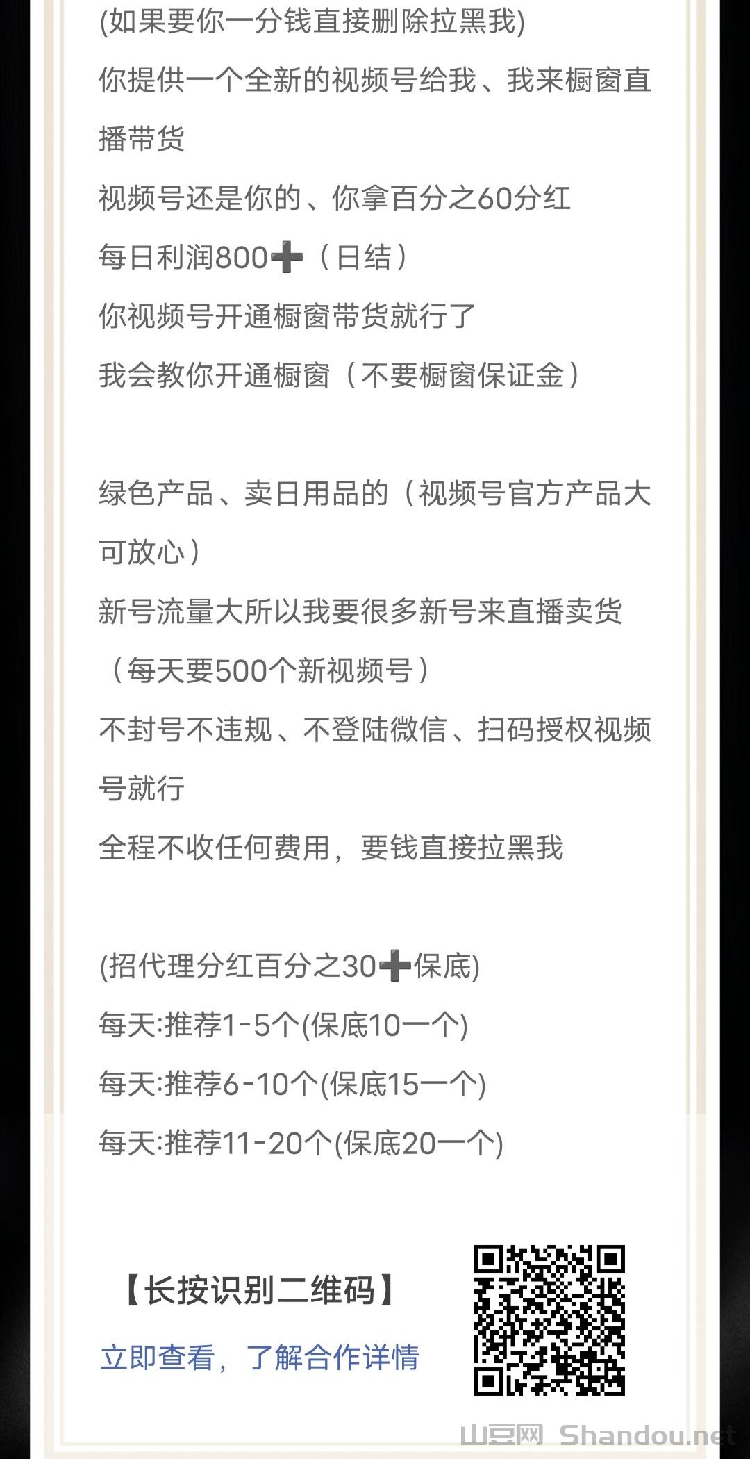 你提供一个全新的视频号给我、我来橱窗直播带货,视频号还是你的、你拿百分之60分红!