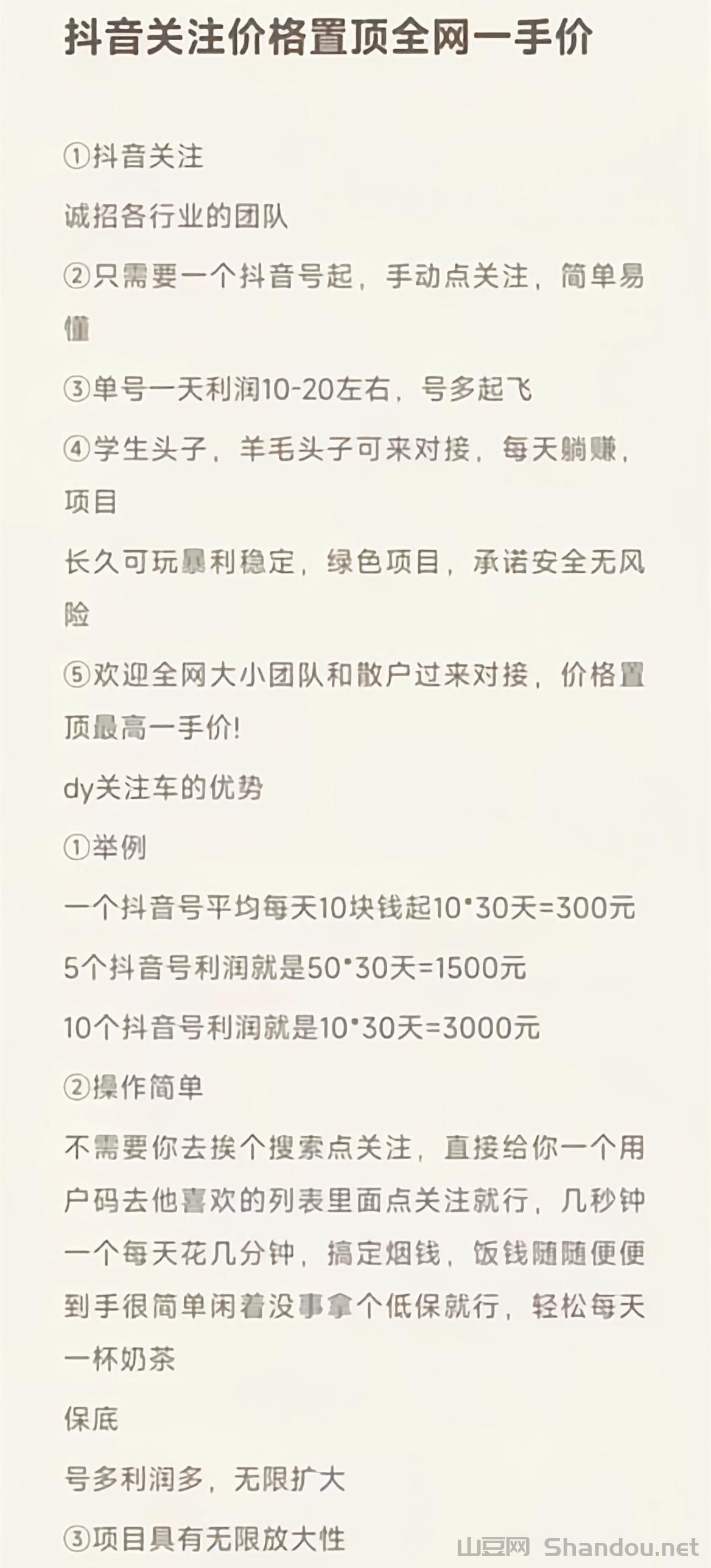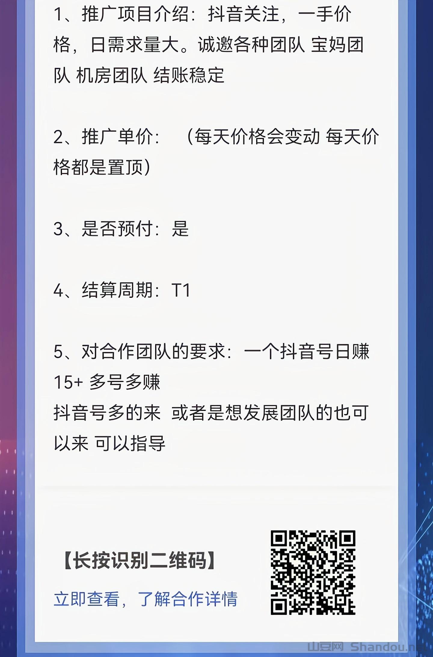 正文 抖音关注,一手价格可以预付 admin V管理员 /01-21/2阅读/0评论 0121 1、推广项目介绍:抖音关注,一手价格,日需求量大。诚邀各种团队宝妈团队机房团队结账稳定2、推广单价:(每天价格会变动每天价格都是置顶)3、是否预付:是4、结算周期:T15、对合作团队的要求:一个抖音号日赚15+多号多赚抖音号多的来或者是想发展团队的也可以来可以指导[长按识别二维码]立即查看,了解合作详情
