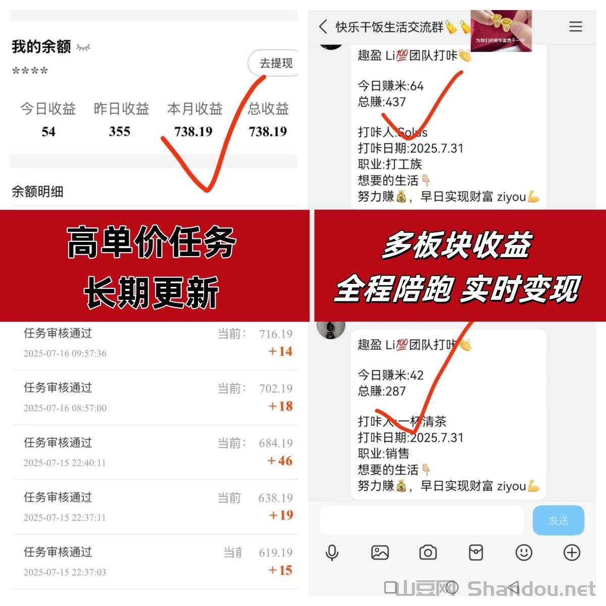 当天加入就能立马变现,每天有空就可以做任务,赚钱轻松,时间自由,每天几十到几百不等;