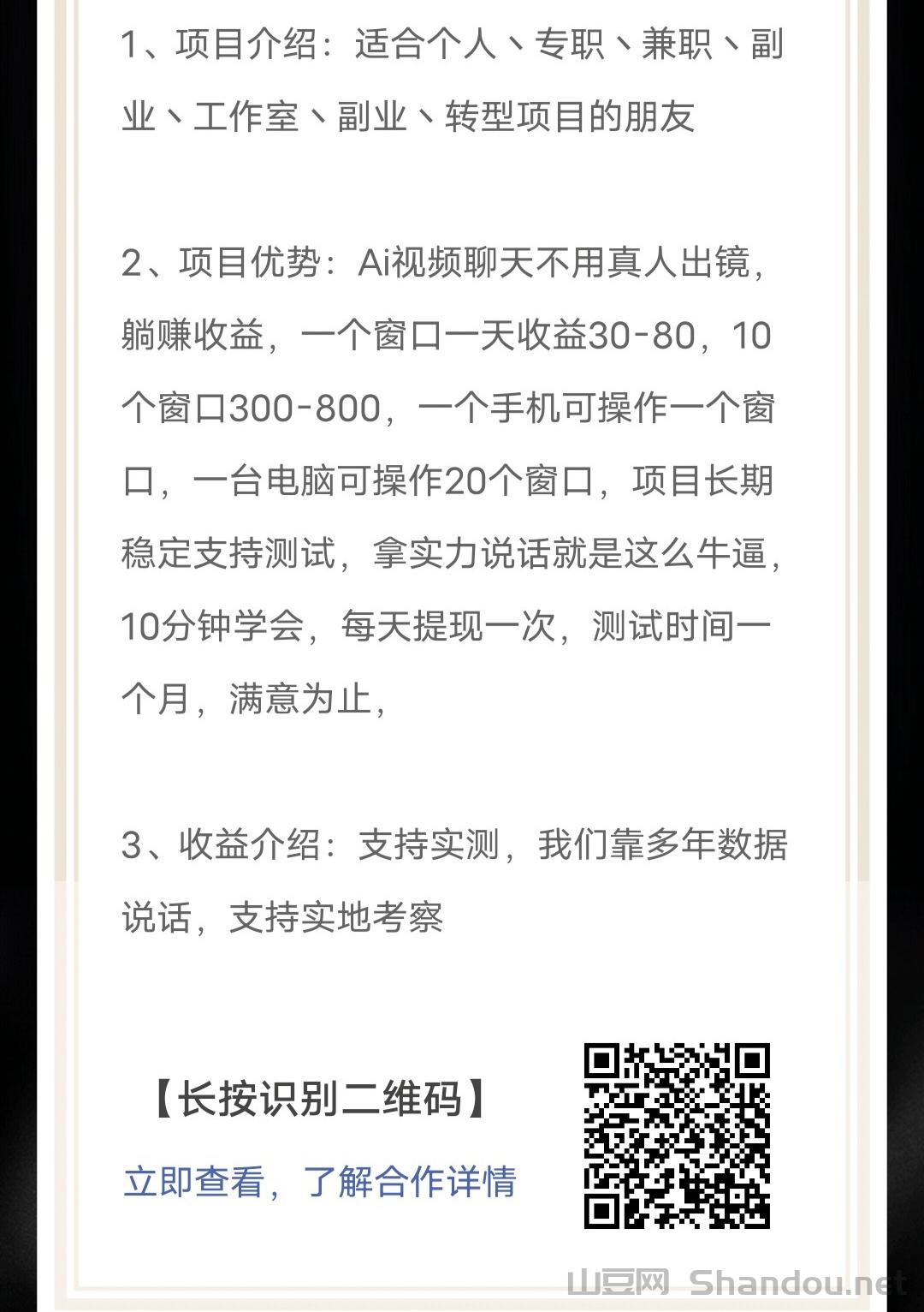 正文 AI搬砖项目、单机30-80+、支持测试 admin V管理员 /01-21/7阅读/0评论 0121 1、项目介绍:适合个人丶专职丶兼职丶副业丶工作室\副业\转型项目的朋友2、项目优势:Ai视频聊天不用真人出镜,躺赚收益,一个窗口一天收益30-80,10个窗口300-800,一个手机可操作一个窗口,一台电脑可操作20个窗口,项目长期稳定支持测试,拿实力说话就是这么牛逼,10分钟学会,每天提现一次,测试时间一个月,满意为止,3、收益介绍:支持实测,我们靠多年数据说话,支持实地考察【长按识别二维码】立即查看,了解合作详情